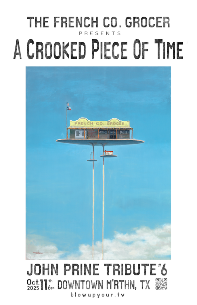 I collaborated with the famed Texas painter, Matt Tumlinson, on the event poster for The 6th Annual John Prine Night at The French Co. Grocer in Marathon, TX. Matt’s surreal painting of the store was the central focus of the work, while my scope was layout and typography.